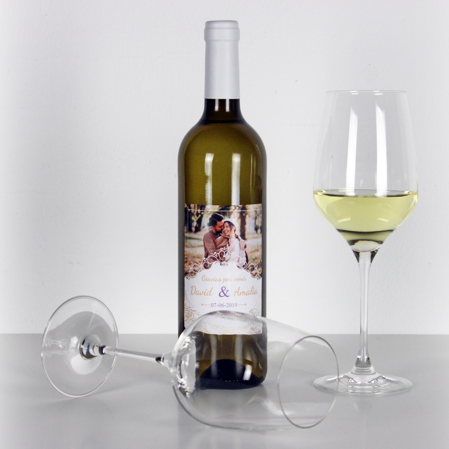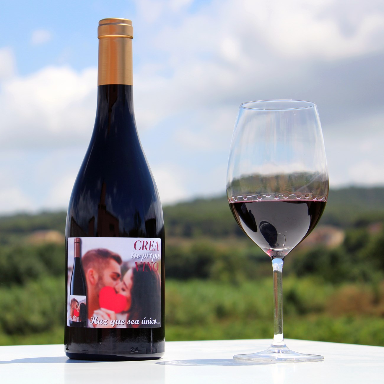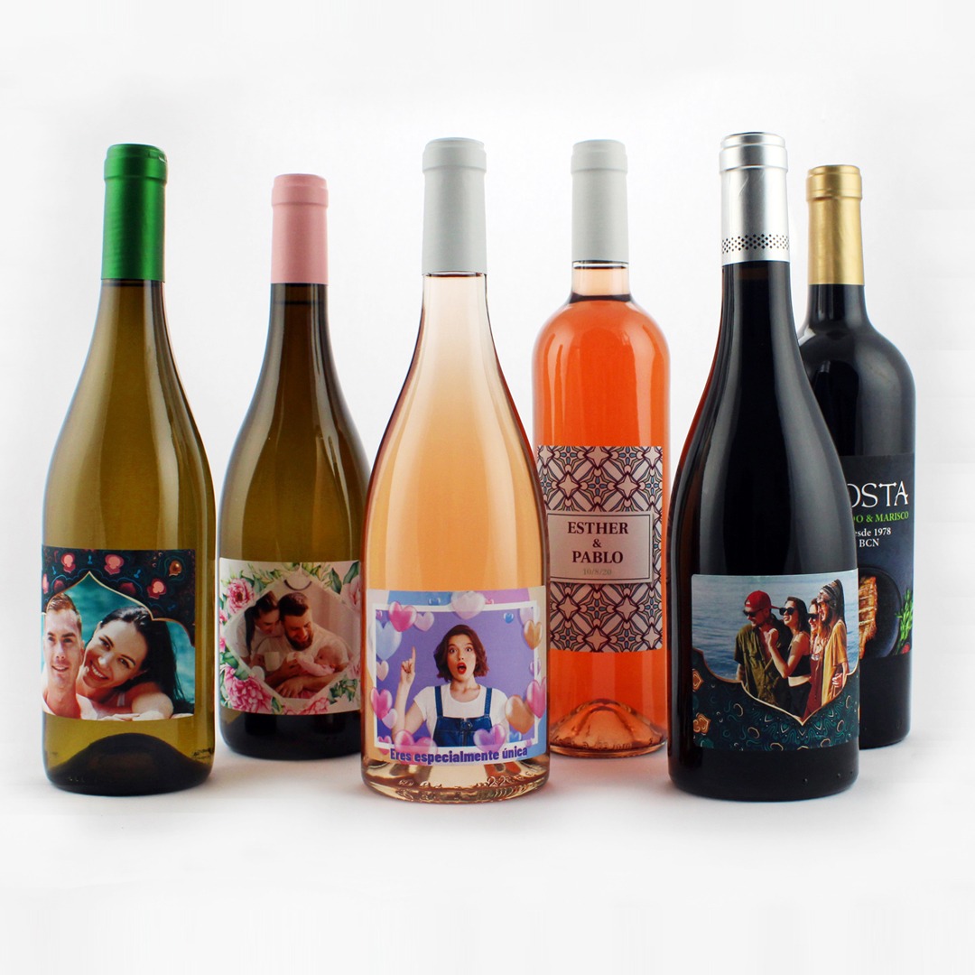 Personaliza tu botella de vino con fotos y textos, personaliza la etiqueta delantera y la etiqueta trasera, con mensajes, dedicatorias, agradecimientos, y mucho más. Haz un regalo único y original donde marcarás la diferencia.