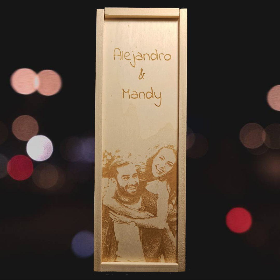A partir de aquí podrás personalizar tu caja de madera con fotos y textos y ya habrás terminado tu Kit de 1 copa de vino grabada con estuche de madera personalizado Modelo para Enamorados.