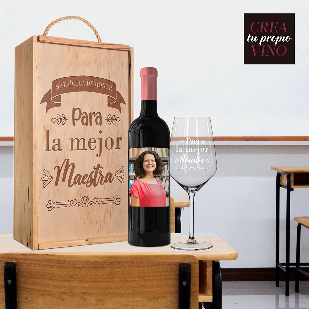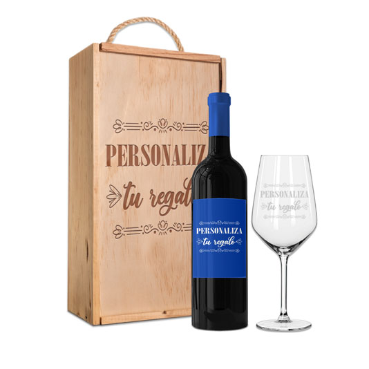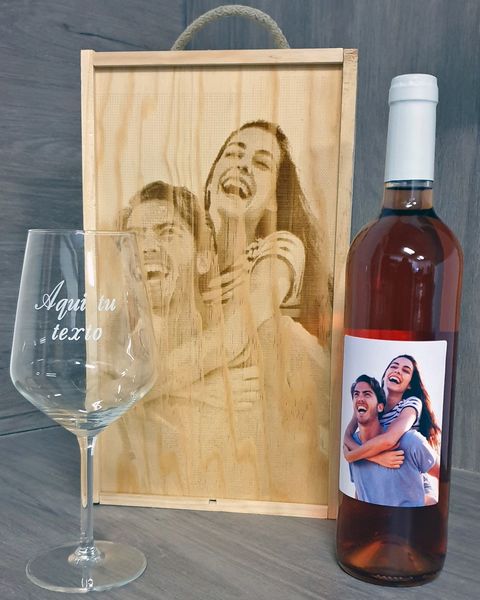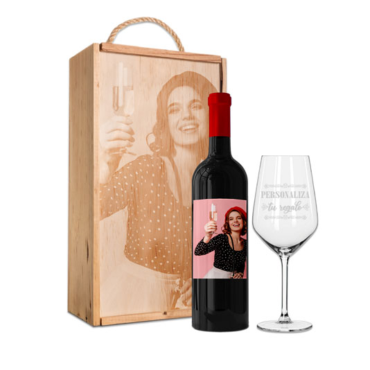 Personaliza tu set de vino con caja y copa con fotos y textos, personaliza las etiquetas delantera y trasera, personaliza la caja de vino de madera y la copa, con mensajes, dedicatorias, agradecimientos, y mucho más. Haz un regalo único y original donde marcarás la diferencia.