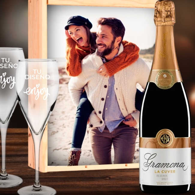 Haz un regalo original con botella espumoso Reserva Corpinnat, caja de madera y 2 copas personalizables.