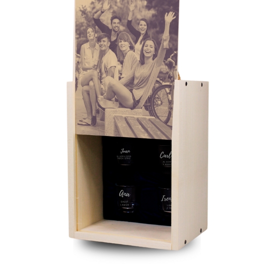 Personaliza tu Kit de 6 chupitos personalizados con caja de madera grabada con fotos y textos, personaliza los chupitos y personaliza la caja de madera, con mensajes, dedicatorias, agradecimientos y mucho más. Haz un regalo único y original donde marcarás la diferencia.