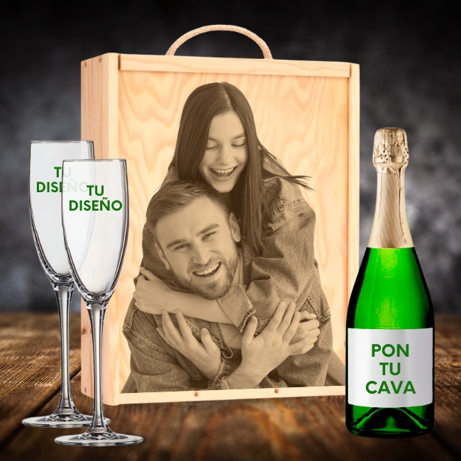 ℹ️ Importante: este kit no incluye la botella de cava. Está pensado para que añadas tu cava favorito y completes un regalo a medida. El pack incluye 2 copas de cava personalizadas y la caja de madera personalizada con compartimento para botella estándar de 75 cl.