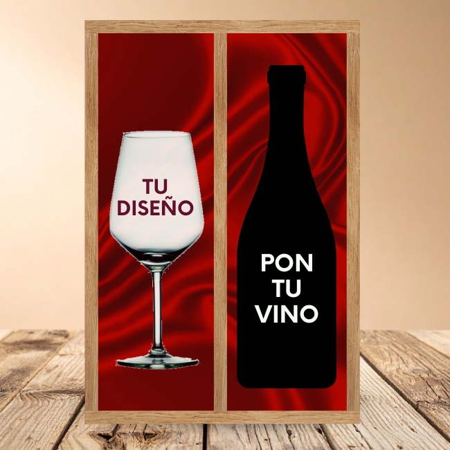 Este elegante estuche está diseñado para que pongas la botella que prefieras y la conviertas en un regalo único. Nosotros nos encargamos del resto: una copa de vino grabada con nombres, iniciales o frases especiales, y una caja de madera personalizable que hará que tu vino tenga una presentación con alma.