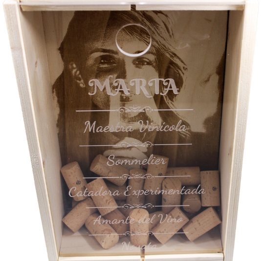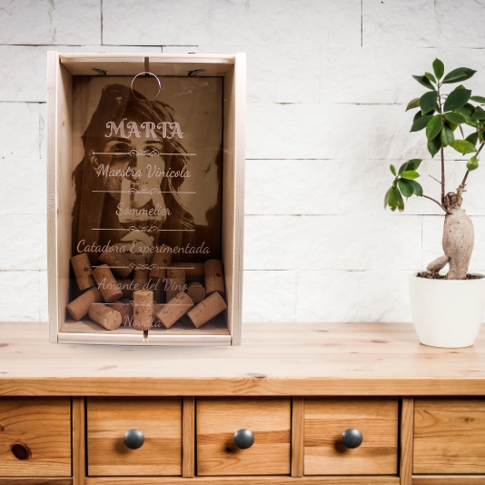 Idea de regalo original personaliza tu portacorchos con niveles divertidos y tu nombre en la tapa de metacrilato