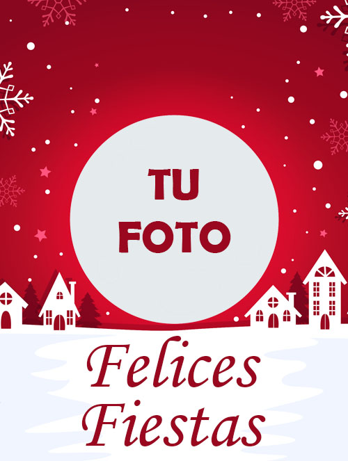 Etiqueta para vinos de Navidad casitas y fondos rojos, puedescambiar la foto, editar y añadir textos.