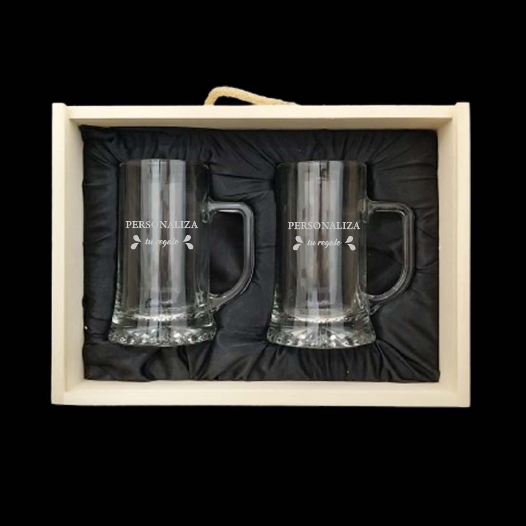 Kit de 2 Jarras de cerveza grabadas con estuche de madera personalizado.