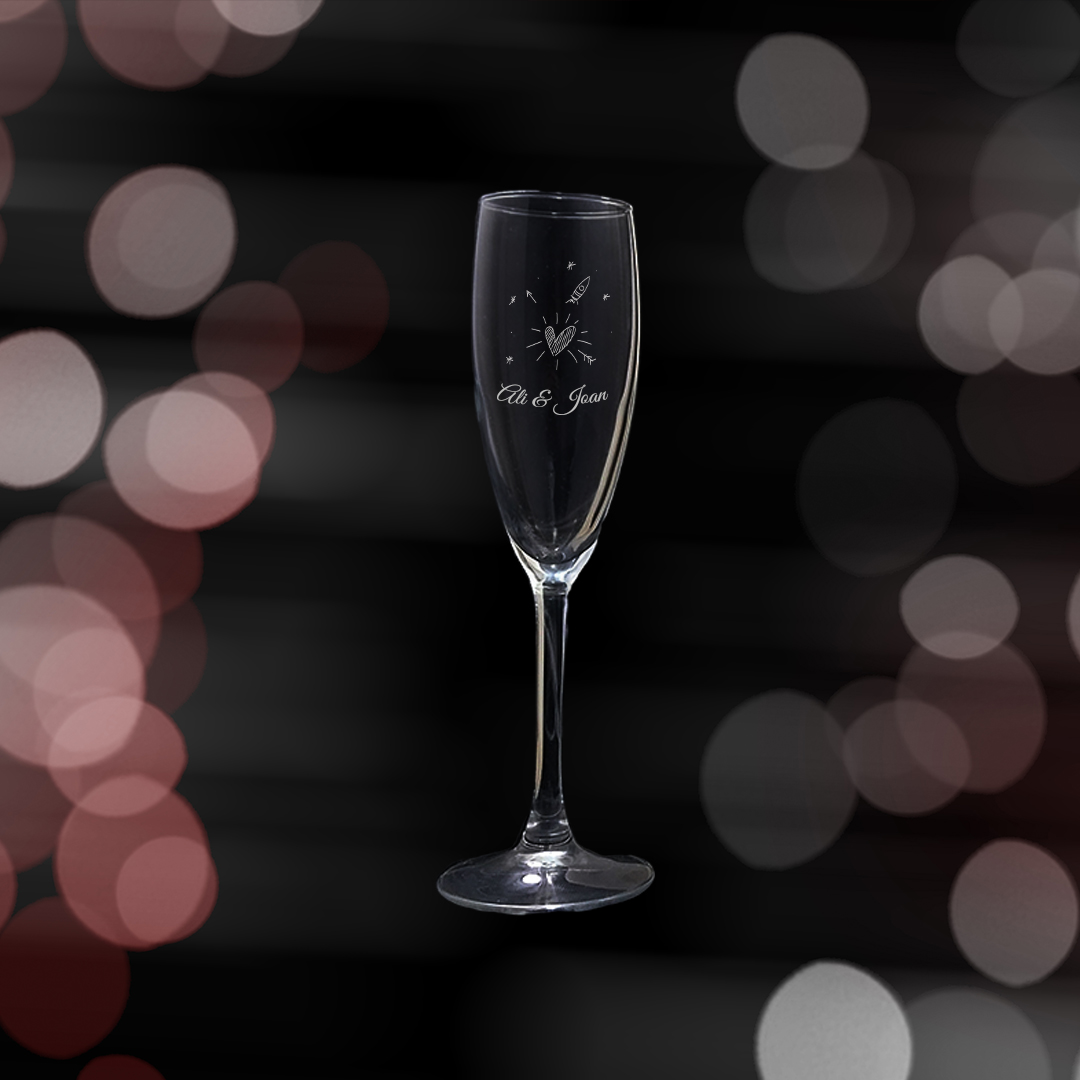 Juega y diviértete creando tu Kit de 1 copa de cava grabada con estuche de madera personalizado Modelo Corazón Estelar.