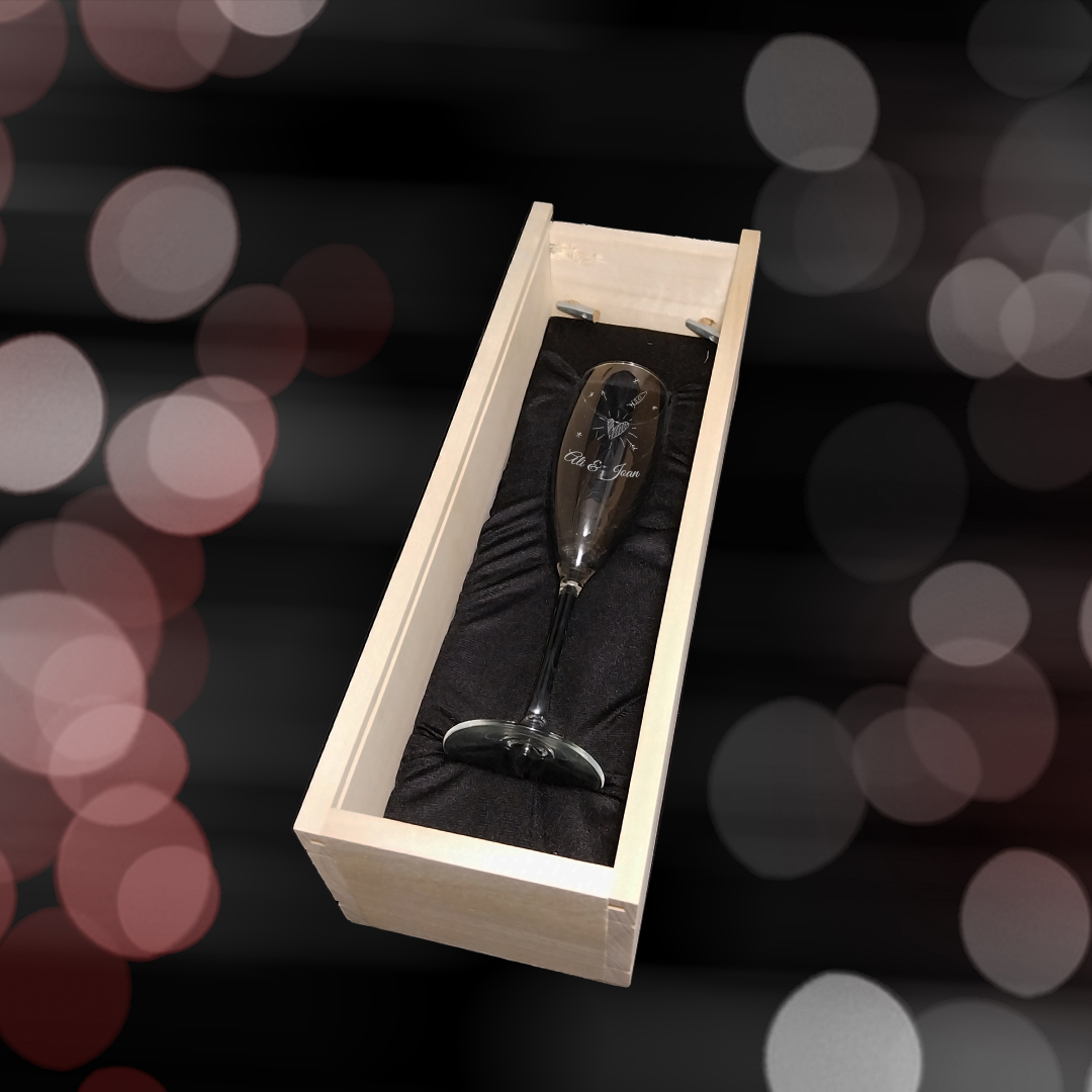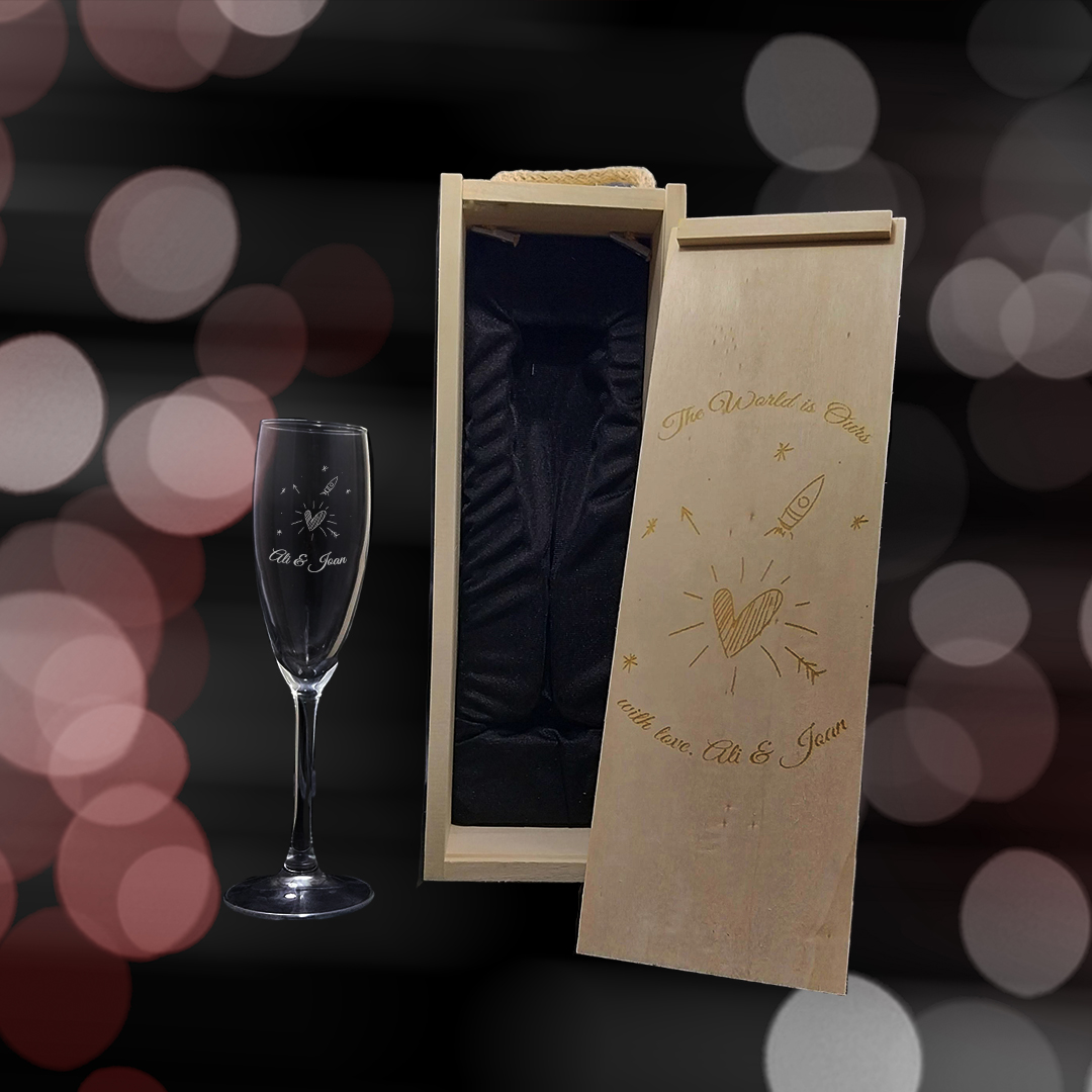 Personaliza tu Kit de 1 copa de cava grabadas con estuche de madera personalizado Modelo Corazón Estelar con fotos y textos, personalizada la copa y la caja de madera, con mensajes, dedicatorias, agradecimientos, y mucho más. Haz un regalo único y original donde marcarás la diferencia.