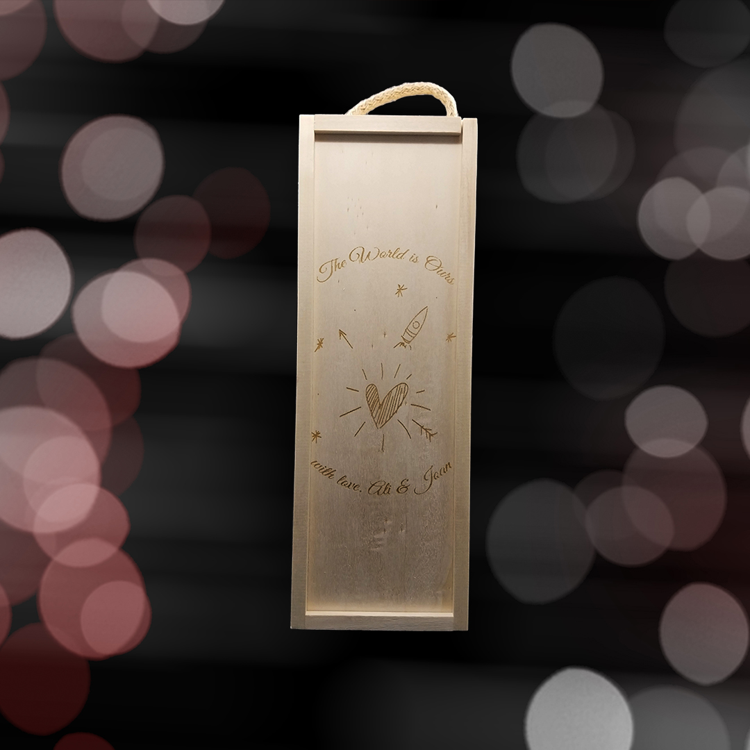 A partir de aquí podrás personalizar tu caja de madera con fotos y textos y ya habrás terminado tu Kit de 1 copa de cava grabada con estuche de madera personalizado Modelo Corazón Estelar.