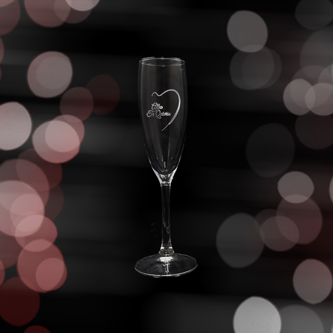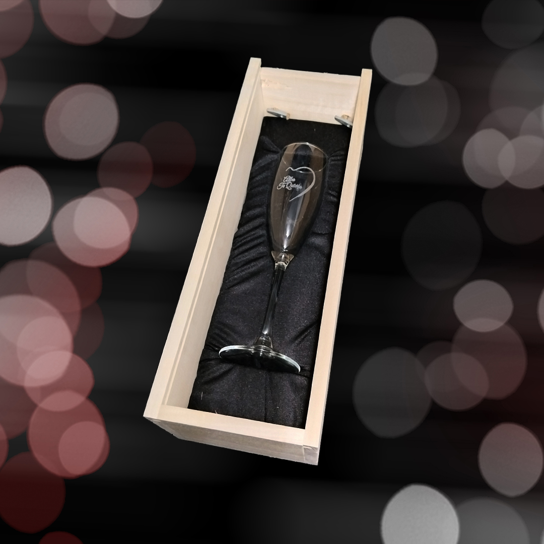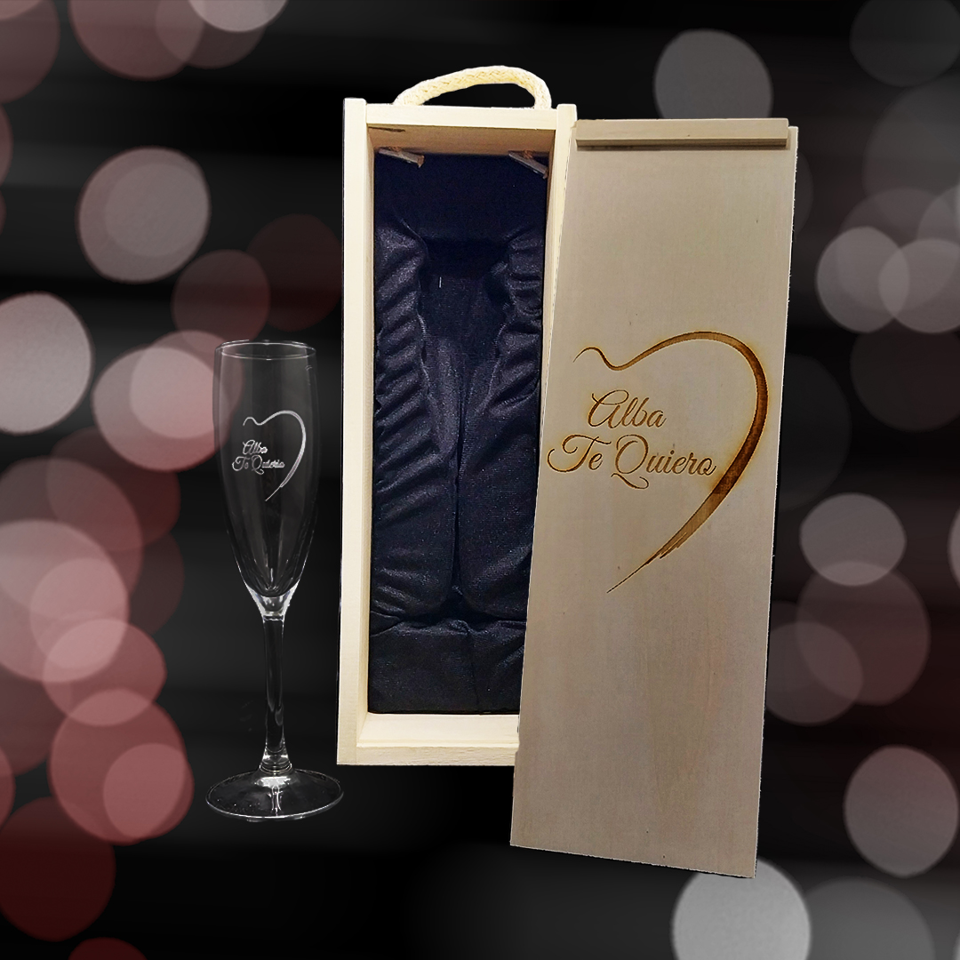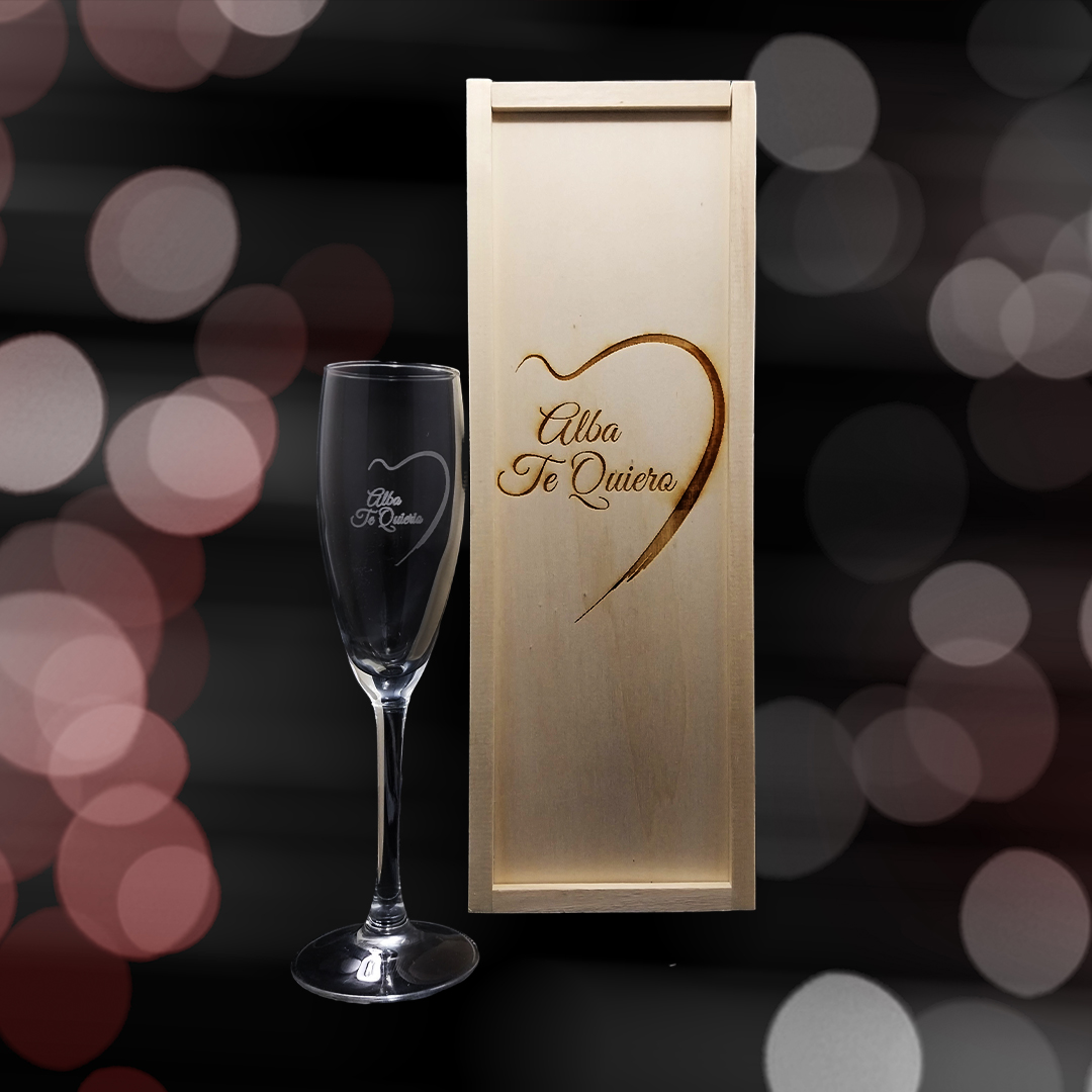 Kit de 1 copa de cava grabada a punta de diamante con estuche de madera personalizado Modelo Corazón.