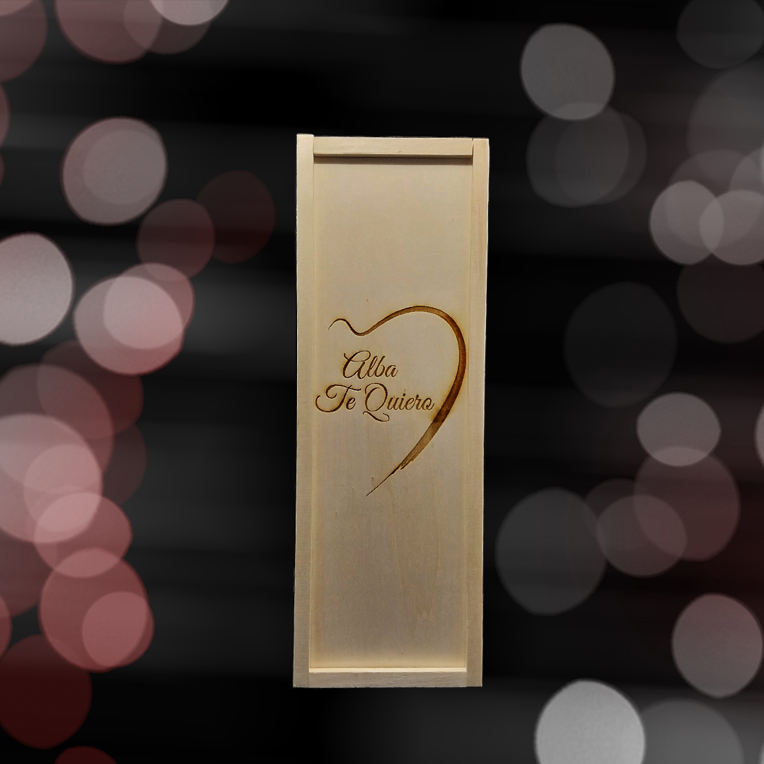 A partir de aquí podrás personalizar tu caja de madera con fotos y textos y ya habrás terminado tu Kit de 1 copa de cava grabada con estuche de madera personalizado Modelo Corazón.