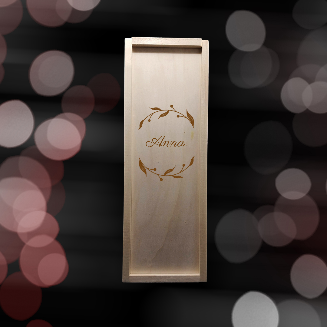 A partir de aquí podrás personalizar tu caja de madera con fotos y textos y ya habrás terminado tu Kit de 1 copa de cava grabada con estuche de madera personalizado Modelo Corona de Hojas.
