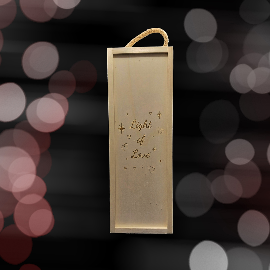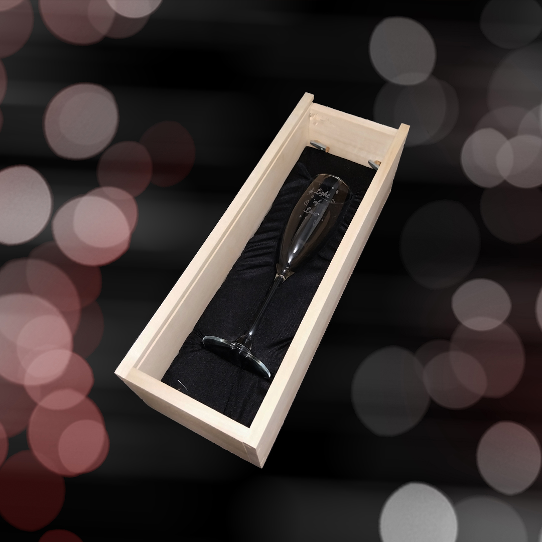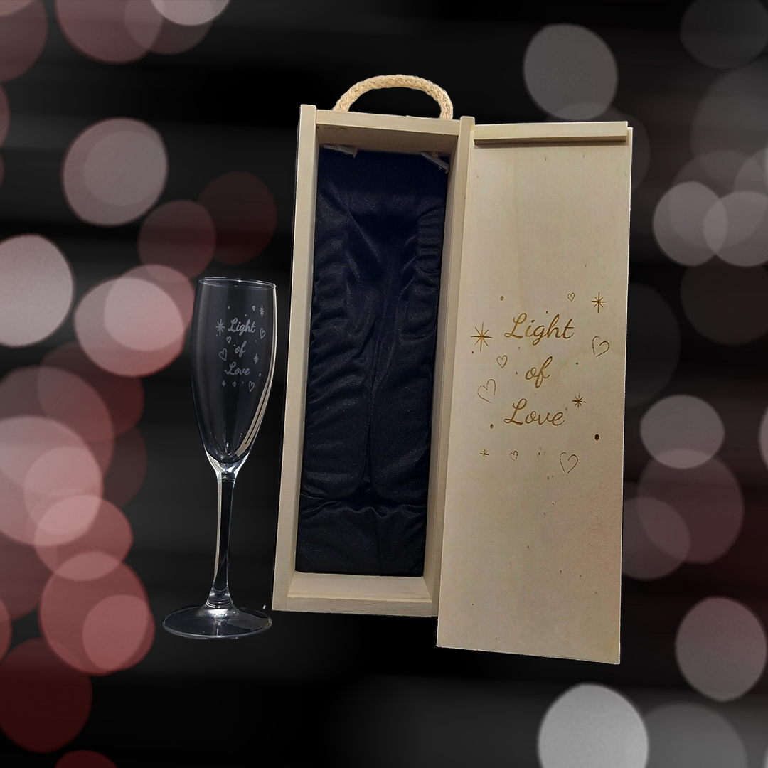Juega y diviértete creando tu Kit de 1 copa de cava grabada con estuche de madera personalizado Modelo Light Of Love.