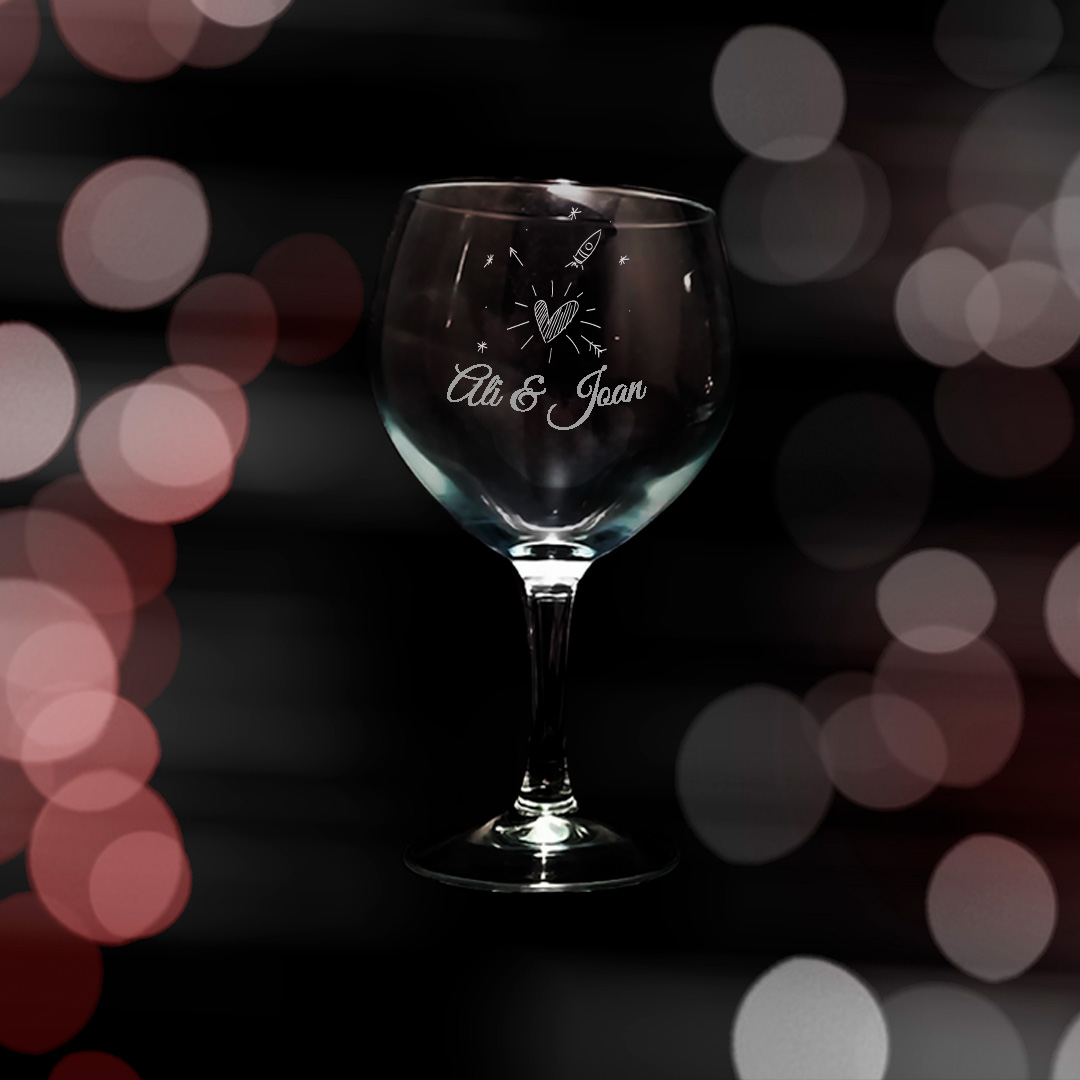 Kit de 1 copa de gintonic grabada a punta de diamante con estuche de madera personalizado Modelo Corazón Estelar.