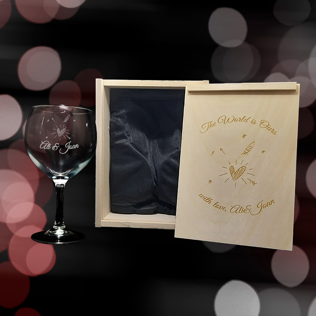 Personaliza tu Kit de 1 copa de gintonic grabadas con estuche de madera personalizado Modelo Corazón Estelar con fotos y textos, personalizada la copa y la caja de madera, con mensajes, dedicatorias, agradecimientos, y mucho más. Haz un regalo único y original donde marcarás la diferencia.