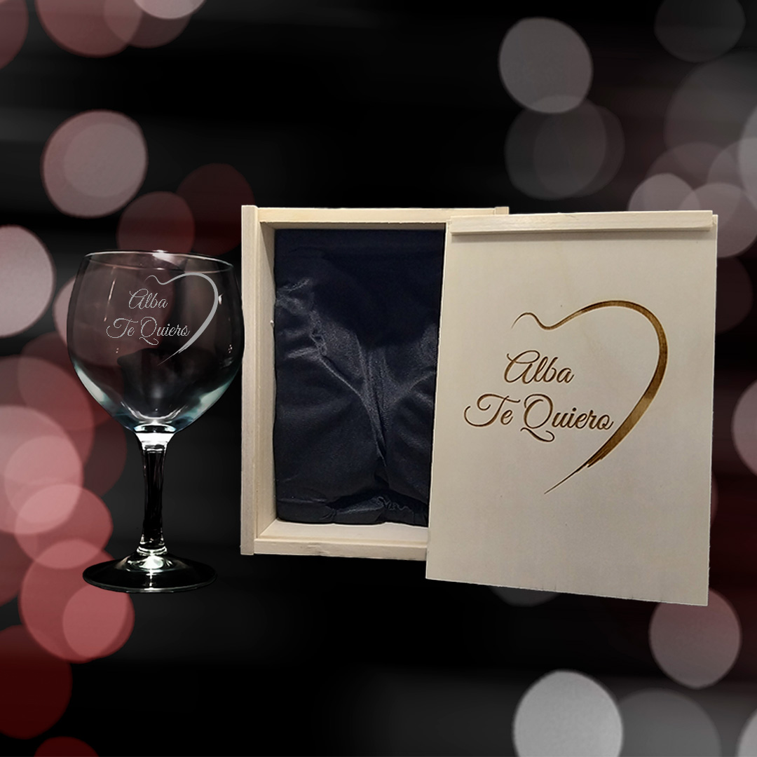 Personaliza tu Kit de 1 copa de gintonic grabadas con estuche de madera personalizado Modelo Corazón con fotos y textos, personalizada la copa y la caja de madera, con mensajes, dedicatorias, agradecimientos, y mucho más. Haz un regalo único y original donde marcarás la diferencia.
