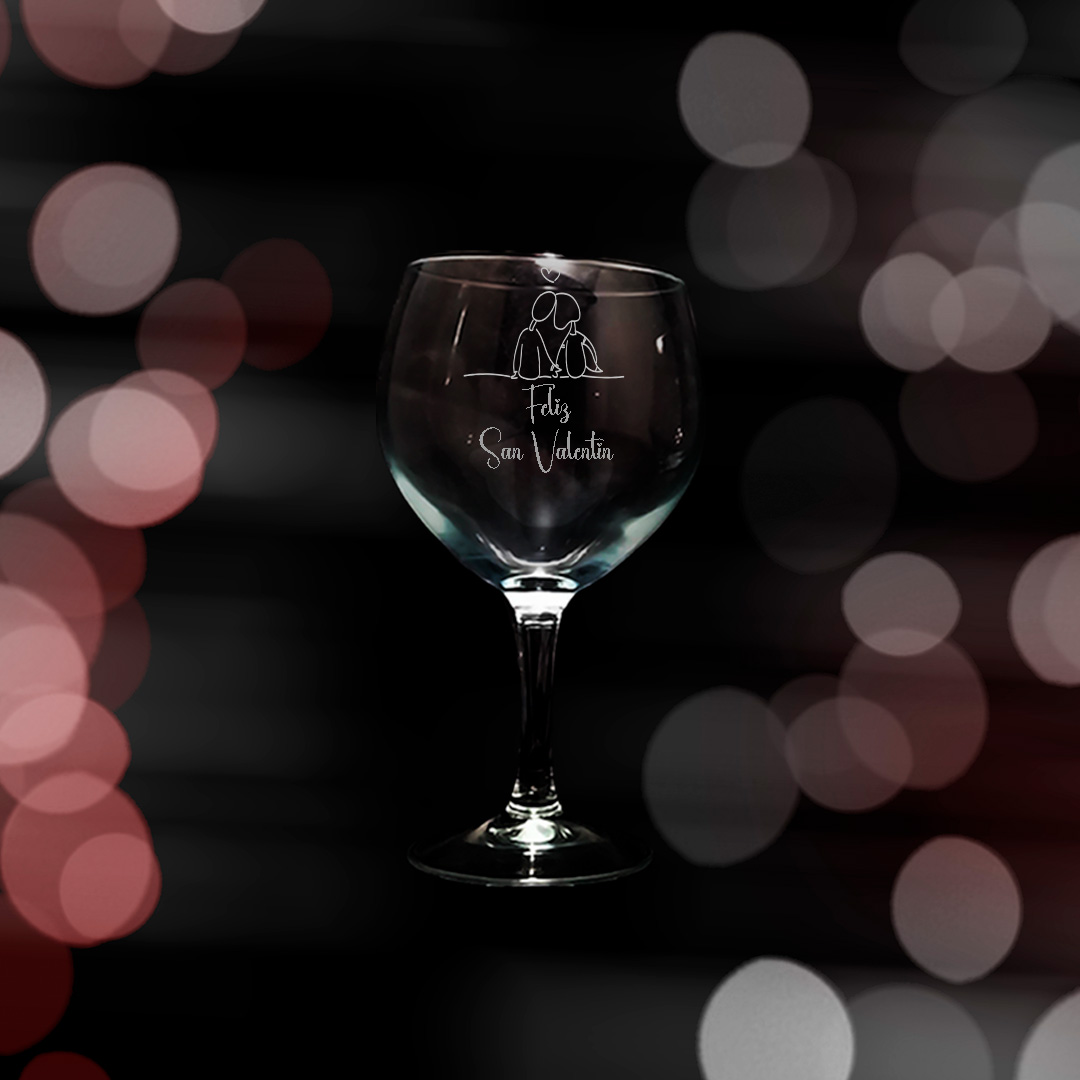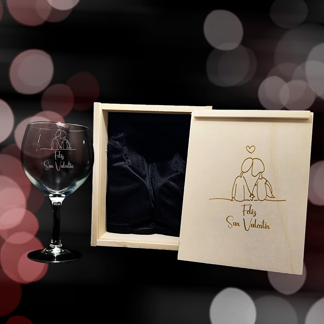 Kit de 1 copa de gintonic grabada a punta de diamante con estuche de madera personalizado Modelo San Valentín.