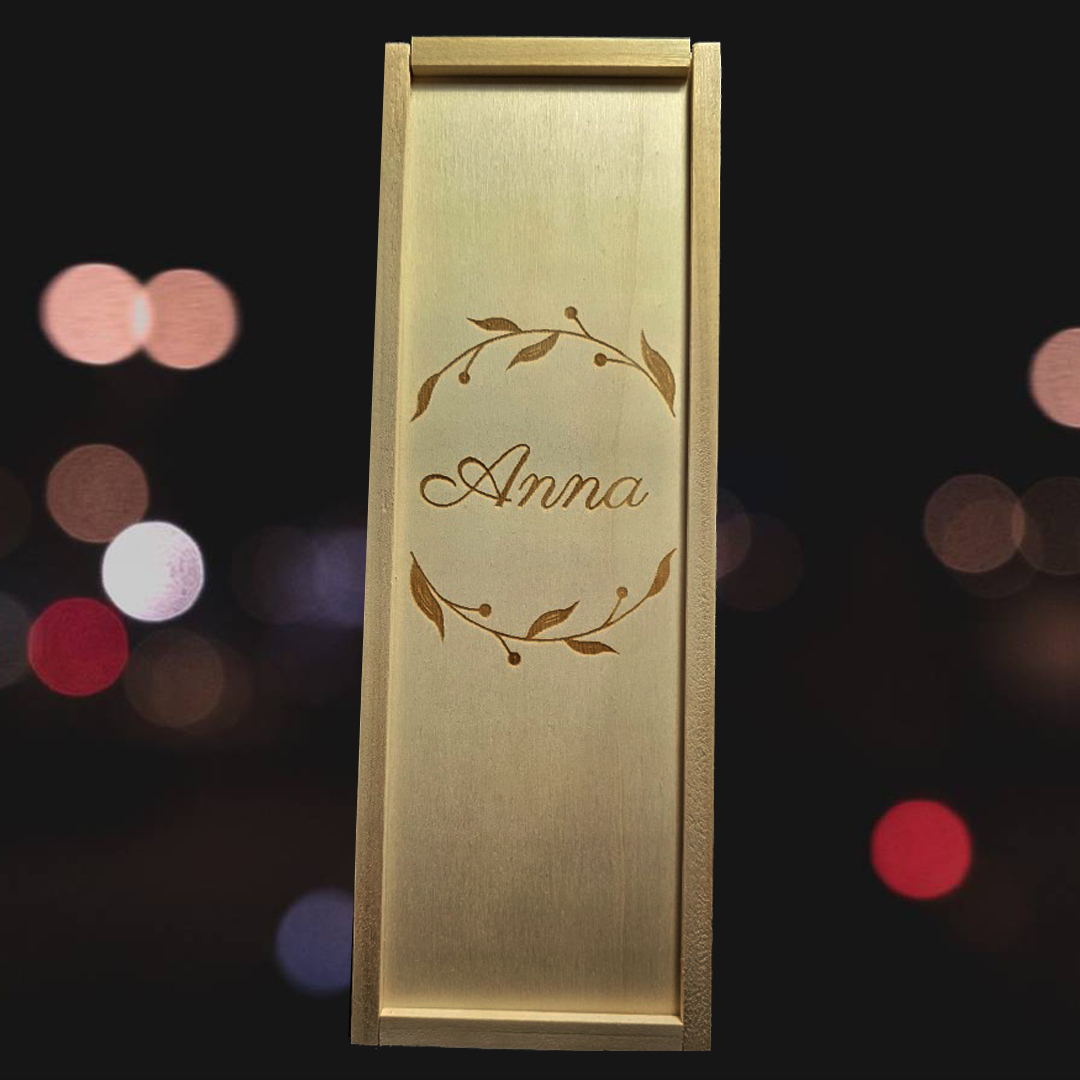 A partir de aquí podrás personalizar tu caja de madera con fotos y textos y ya habrás terminado tu Kit de 1 copa de vino grabada con estuche de madera personalizado Modelo Corona de Hojas.