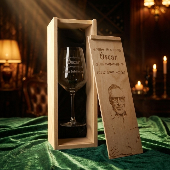 Otros modelos de Kit de 1 copa de vino con estuche de madera personalizado modelo para jubilación con cenefas