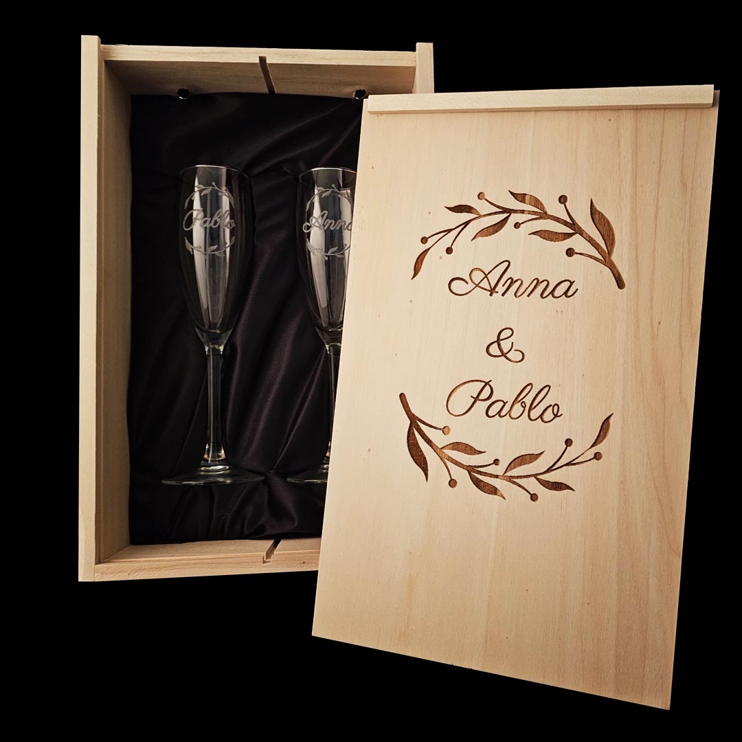 Personaliza tu Kit de 2 copas de cava grabadas con estuche de madera personalizado Modelo Corona de Hojas con fotos y textos, personalizada las copas y la caja de madera, con mensajes, dedicatorias, agradecimientos, y mucho más. Haz un regalo único y original donde marcarás la diferencia.