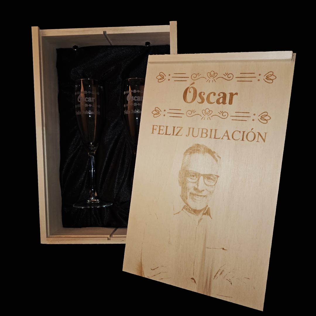 Personaliza tu Kit de 2 copas de cava grabadas con estuche de madera personalizado Modelo para Jubilación con Cenefas con fotos y textos, personalizada las copas y la caja de madera, con mensajes, dedicatorias, agradecimientos, y mucho más. Haz un regalo único y original donde marcarás la diferencia.
