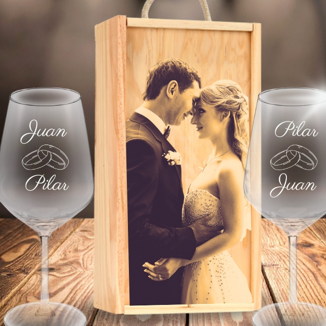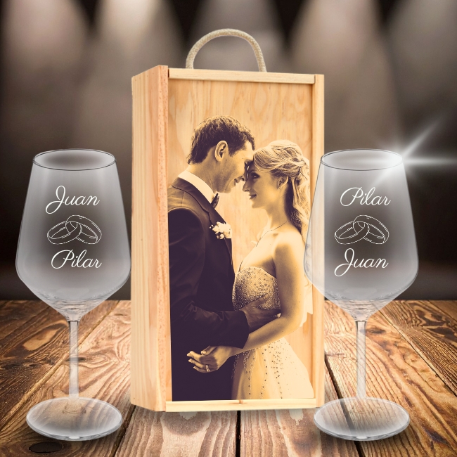 Personaliza tu Kit de 2 copas de vino grabadas con estuche de madera personalizado Modelo para Bodas con Alianzas con fotos y textos, personalizada las copas y la caja de madera, con mensajes, dedicatorias, agradecimientos, y mucho más. Haz un regalo único y original donde marcarás la diferencia.