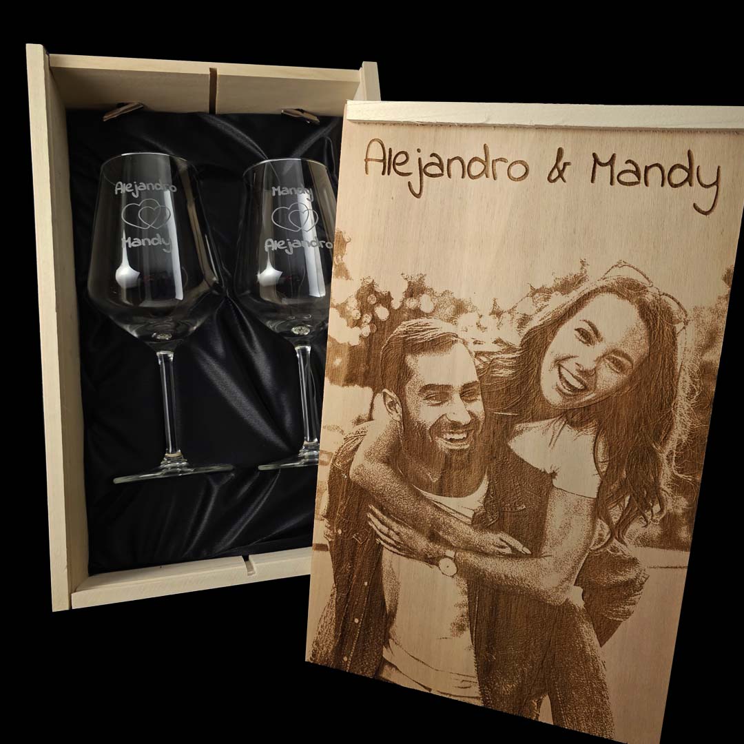 Personaliza tu Kit de 2 copas de vino grabadas con estuche de madera personalizado Modelo para Enamorados con fotos y textos, personalizada las copas y la caja de madera, con mensajes, dedicatorias, agradecimientos, y mucho más. Haz un regalo único y original donde marcarás la diferencia.