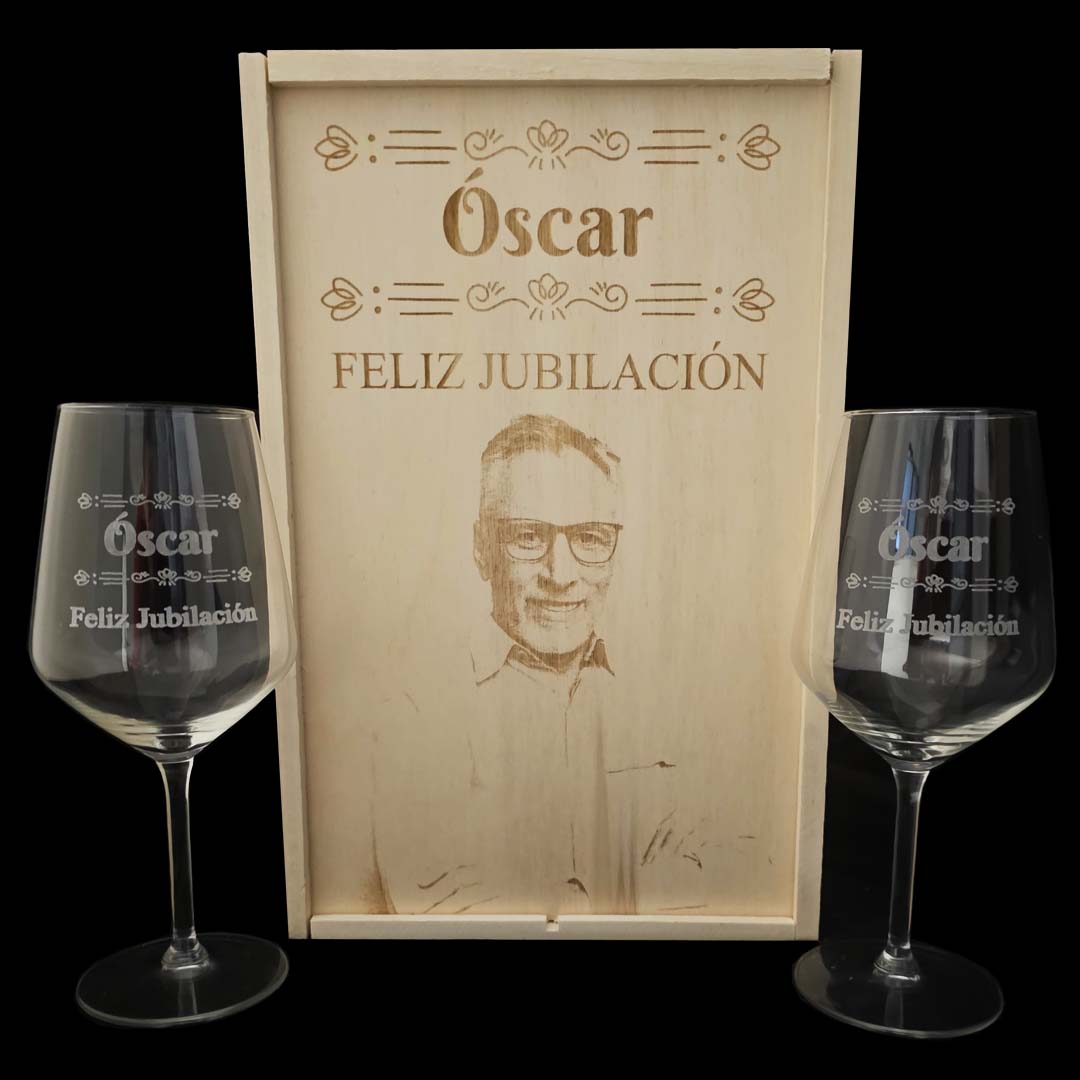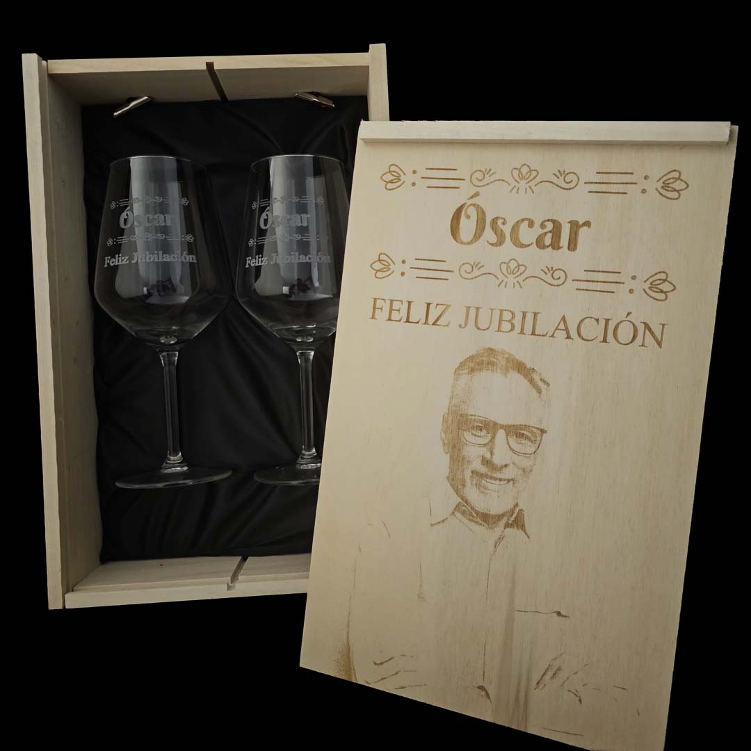 Personaliza tu Kit de 2 copas de vino grabadas con estuche de madera personalizado Modelo para Jubilación con Cenefas con fotos y textos, personalizada las copas y la caja de madera, con mensajes, dedicatorias, agradecimientos, y mucho más. Haz un regalo único y original donde marcarás la diferencia.