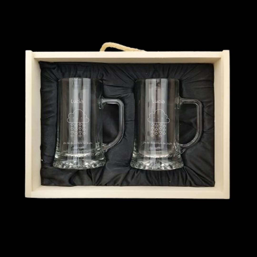 Kit de 2 jarras de cerveza con estuche de madera personalizado modelo bautizo