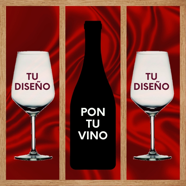 ℹ️ Importante: este kit no incluye la botella de vino. Está pensado para que añadas tu vino favorito y completes un regalo a medida. El pack incluye 2 copas de vino personalizadas y la caja de madera personalizada con compartimento para botella estándar de 75 cl.